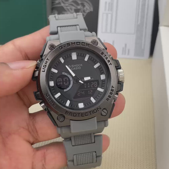 Bezel & Markings: Metal-looking bezel branded with PROTECTION, LIGHT, MODE, START/RESET – typical G‑Shock styling.